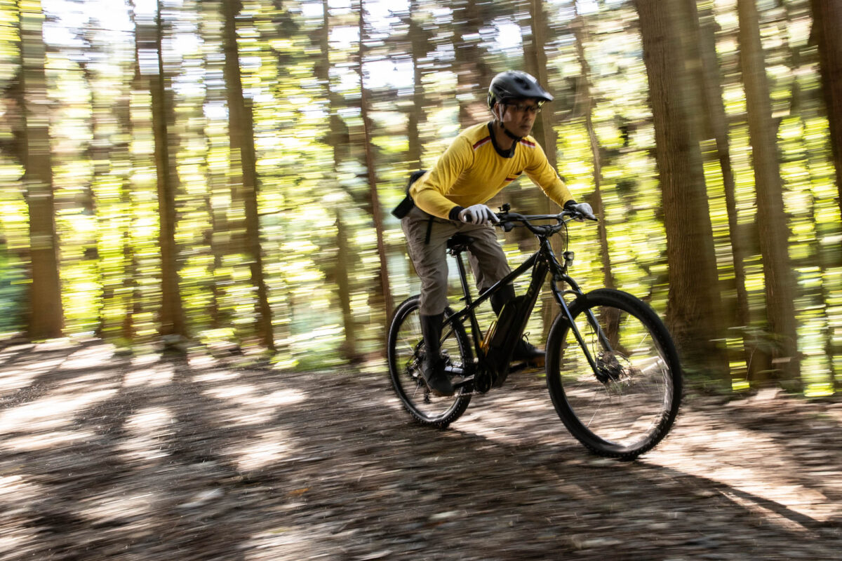 今回走ったコースには、結構な斜度の上り坂もありましたが、ペダルを回しているだけでスイスイと上っていくことができます。ただ、海外製のフルサスe-MTBの車体に任せて上っていける感覚とは少し違い、サスペンションが付いていないので大きめの石や木の根などを乗り越える際には乗り手が抜重操作などをする必要があります。発生するトルクも80Nmオーバーのドライブユニットに比べると、パワー任せに上る感じではないので、自分の力も使って走っているような感覚もありました。