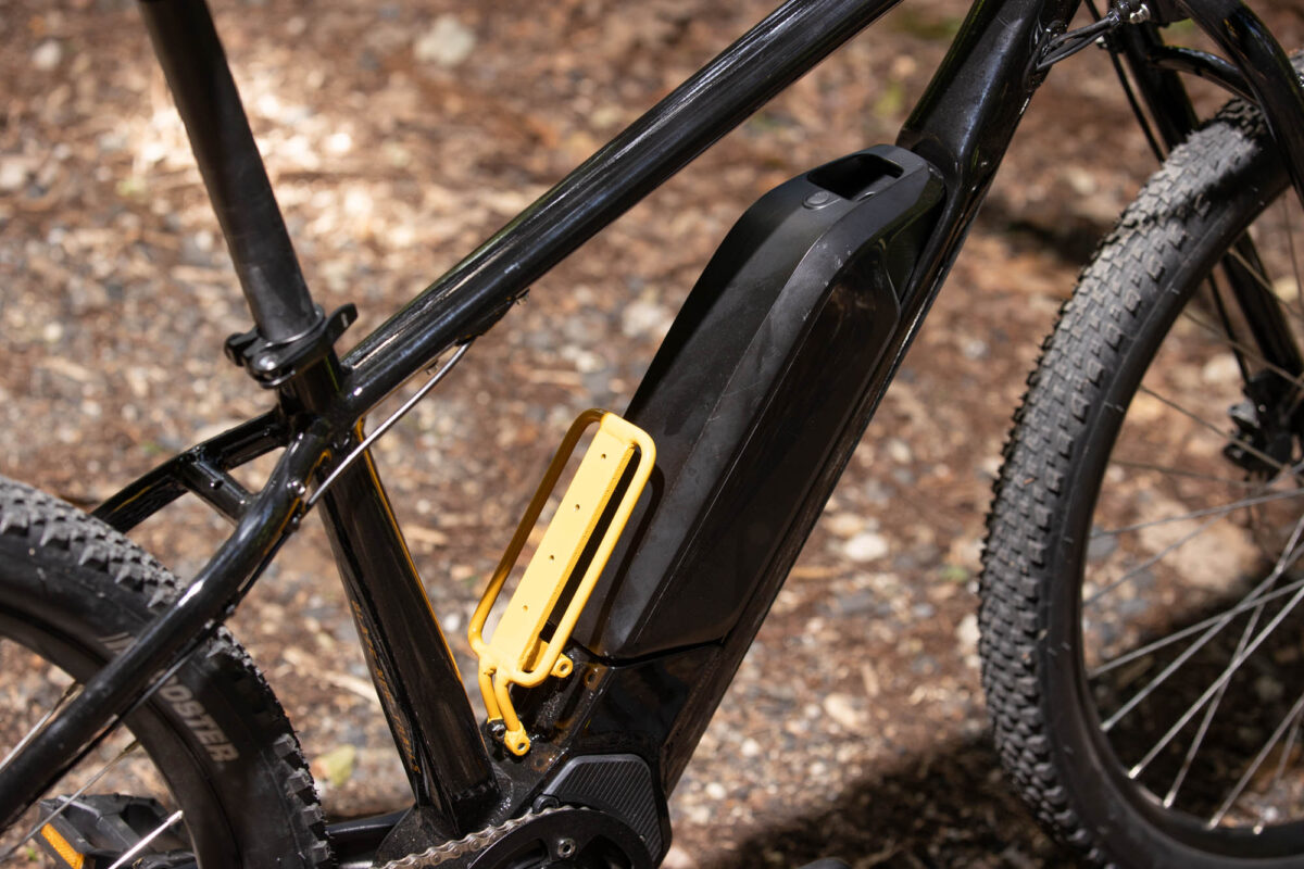 バッテリーの容量は504Wh。エコモードでは約110kmのアシスト走行が可能です。山の中を1日走り回るにも十分な容量。バッテリーを搭載したことで、一般的な位置にボトルケージを取り付けることができませんが、その分ダボなどを設けられる黄色のキャリアを装備し、フレームもトップチューブの表と裏にもダボが装備されています。