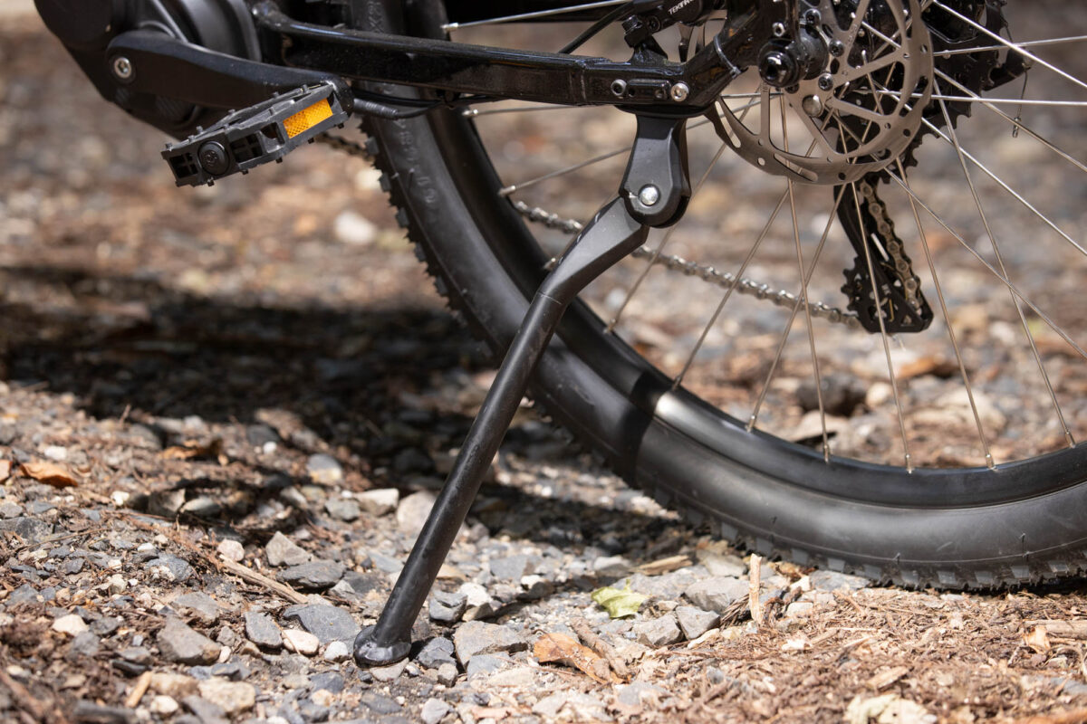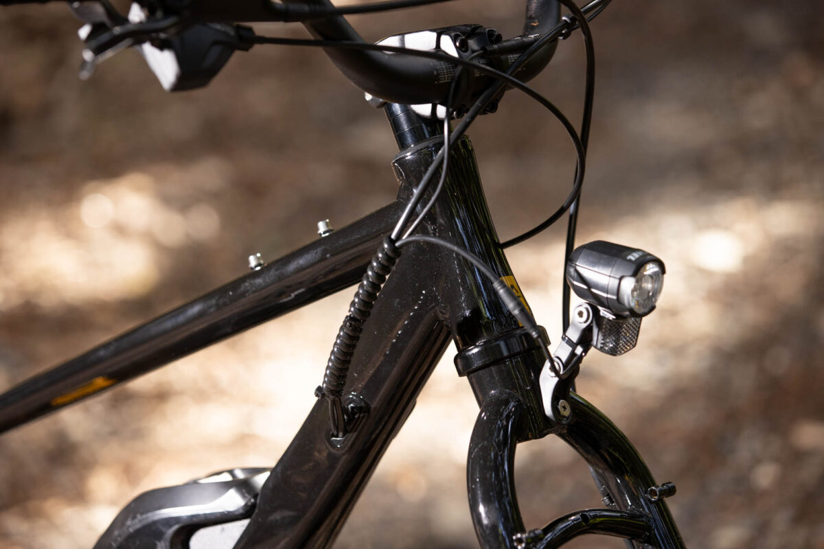 舗装路も20km程度走りましたが、e-MTBとしてはかなり走りやすく、街乗りや通勤にも使えるモデルに仕上がっています。サスペンションがないことで、舗装路での抵抗が少なく、効率良く走ることが可能。少しアップタイプのハンドルが装備されているので、乗車姿勢も前傾姿勢がキツくなく、のんびり走るのが気持ちいい感じ。サイドスタンドや、バッテリーから給電されるライトも装備されているので、街乗りも快適にこなせます。