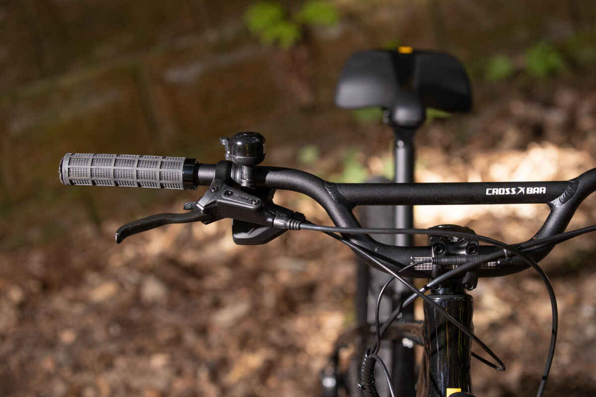ハンドルはブレースを装備したBMX的な形状。しかもブレースの部分が22.2mmとなっており、これはスマホホルダーのようなアクセサリーが装着しやすいようにとの配慮です。