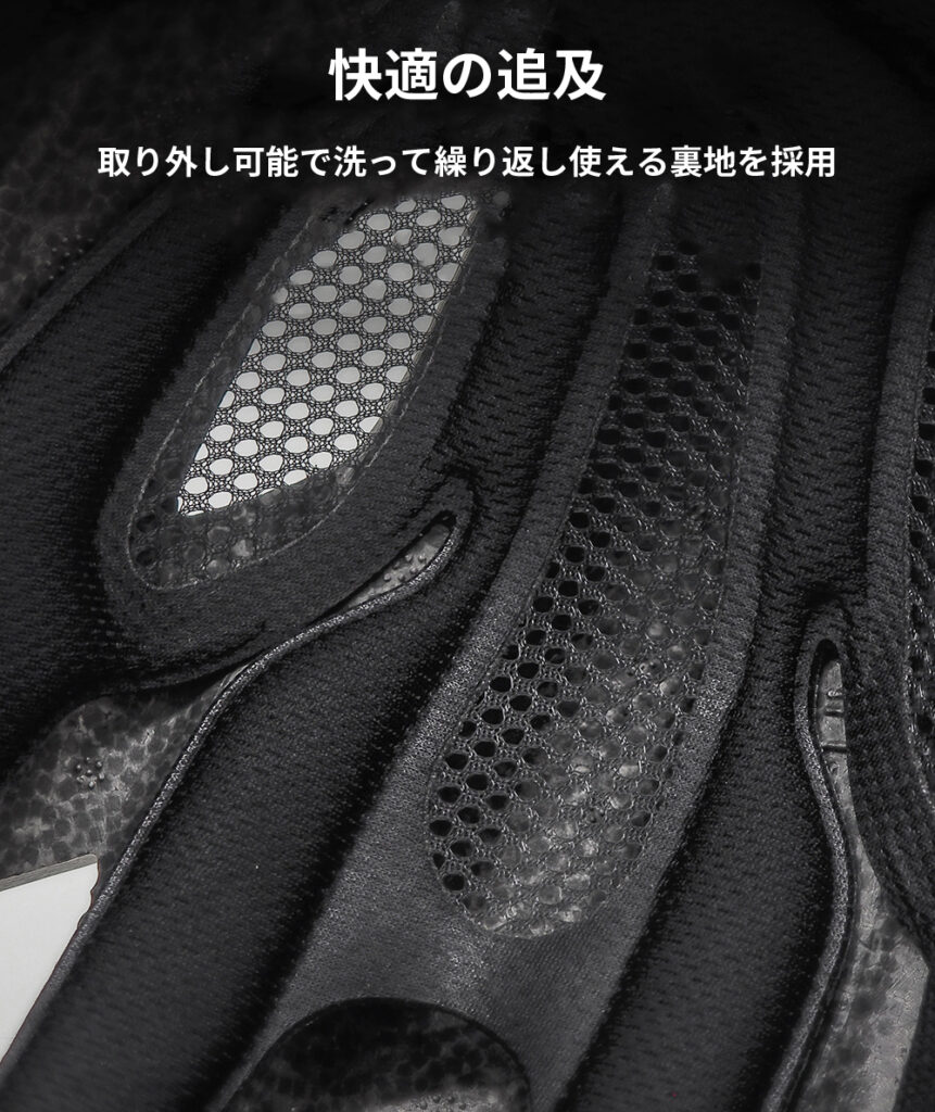 蒸れによる不快感を軽減し、取り外し可能な通気性の良い裏地を内部に採用。