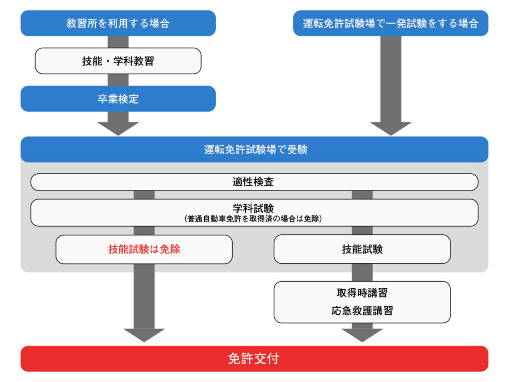 普通免許を保有し教習所を卒業している場合は、本試験の学科と技能が免除されます。