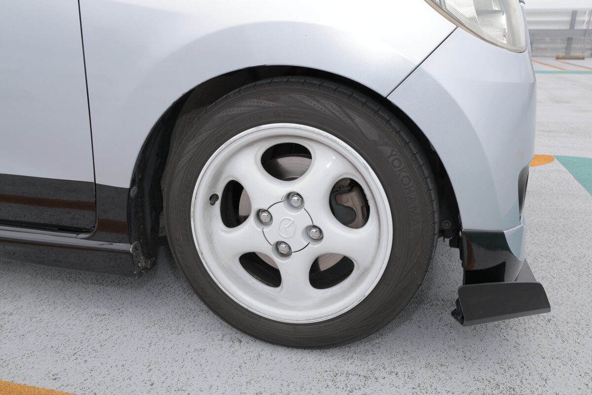 NBロードスターの純正ホイールを流用して装着。ただし、サーキット用には別のセットも用意してあり「撮影があるのだったら、あっちにしておけば良かった」と後悔も。ぜひサーキット用のセットで再登場していただきたい!