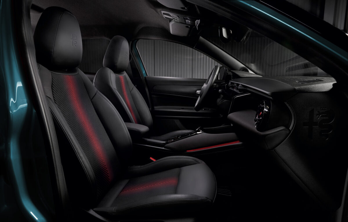 ローンチを記念した限定車 「Junior Ibrida Speciale(ジュニア イブリダ スペチアーレ)」 は、ラインナップの最上位にあたるモデルです。アルファ ロメオの象徴である「スクデット」(盾グリル)が、BEVモデル同様にプログレッソ・デザインとなるほか、サンルーフ、マットブラック&レッドインサートボディキット、レザー&アルカンターラステアリングホイール、サベルト製スポーツシートが備わります。