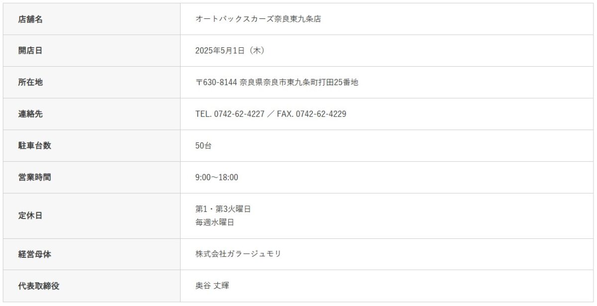 株式会社オートバックスセブンは、車買取・販売事業「オートバックスカーズ」において、奈良県の株式会社ガラージュモリとフランチャイズ契約を締結し、2025年5月1日に「オートバックスカーズ奈良東九条店」を新規オープンする。