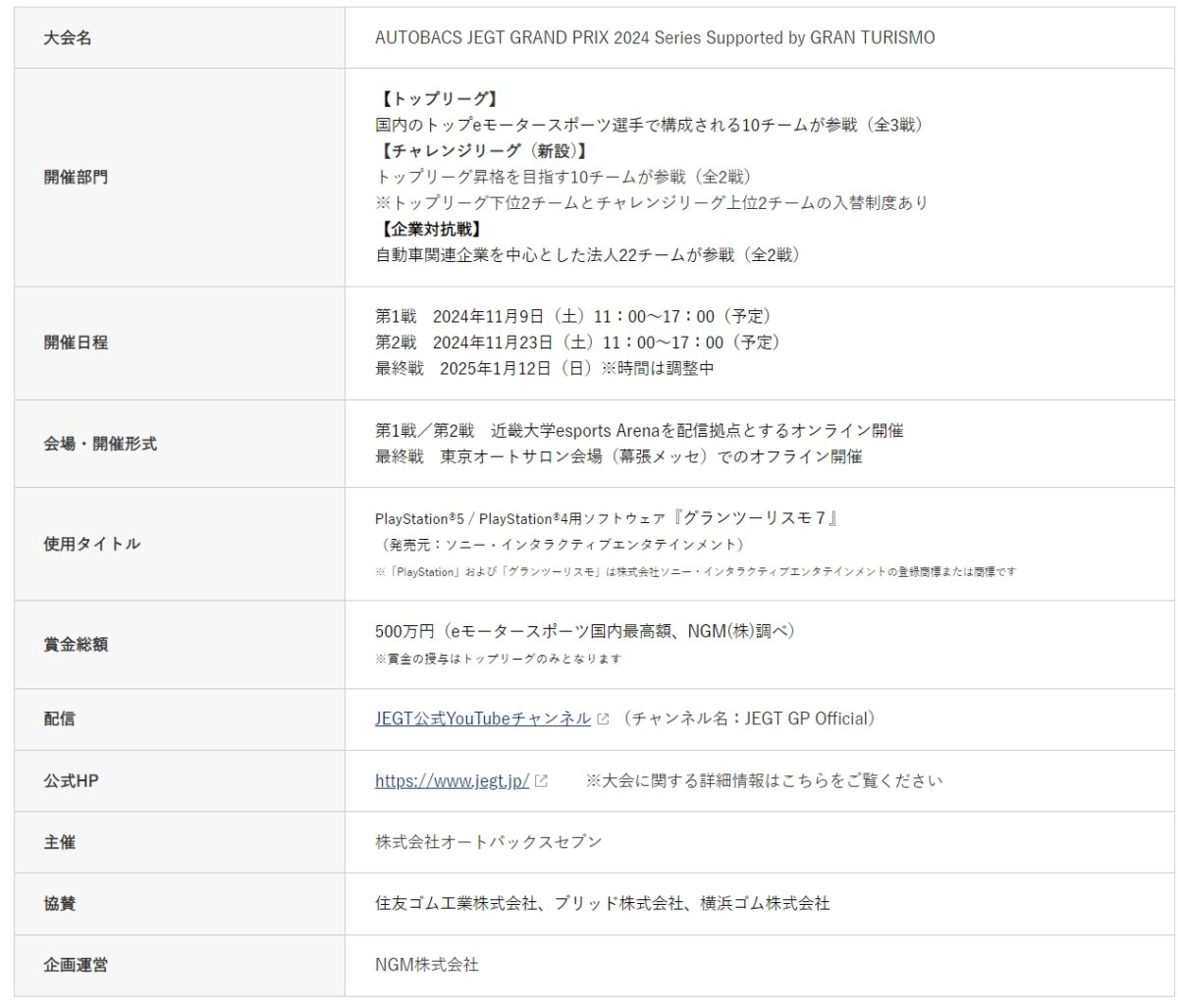 株式会社オートバックスセブンは、eモータースポーツの公式大会「AUTOBACS JEGT GRAND PRIX 2024 Series」を2024年11月9日(土)より開幕すると発表した。