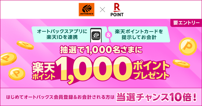 | キャンペーン名称 | 「オートバックスアプリ連携・楽天ポイントカード提示で1,000名様に1,000ポイント」 |