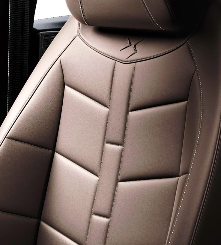高級腕時計のストラップをモチーフにしたシートは、立体的で洗練された造形が特徴です。背面と座面を一枚革で仕立て、熟練職人の技で快適性と美しさを両立。フランスの美意識と“サヴォア・フェール(匠の技)”が息づく、DSならではの特別な装いです。