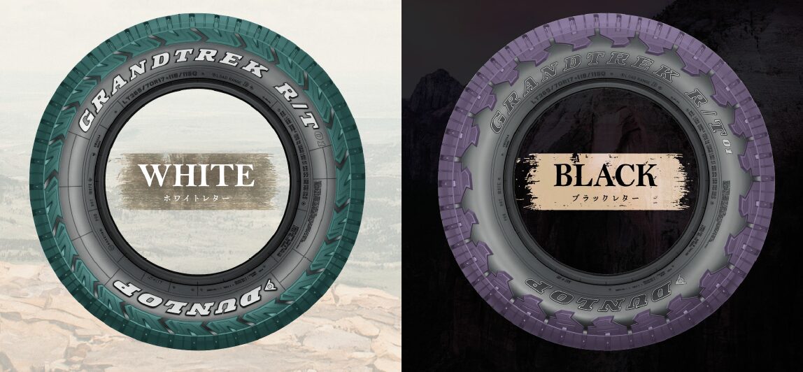 「GRANDTREK R/T01」は、耐久性・走破性に加え、見た目にもこだわるユーザーの心を躍らせるタイヤとして新たに誕生しました。特にサイドウォールには細部まで意匠を凝らし、両面で異なる表情を楽しめる仕様を採用。大自然をモチーフにした2種類のデザインを施し、片面にはホワイトレター、もう片面にはブラックレターでそれぞれ「GRANDTREK R/T01」のモデル名を表記しています。装着時には好みに応じて、いずれかの面を外側に向けて装着することで、愛車の魅力を際立たせます。