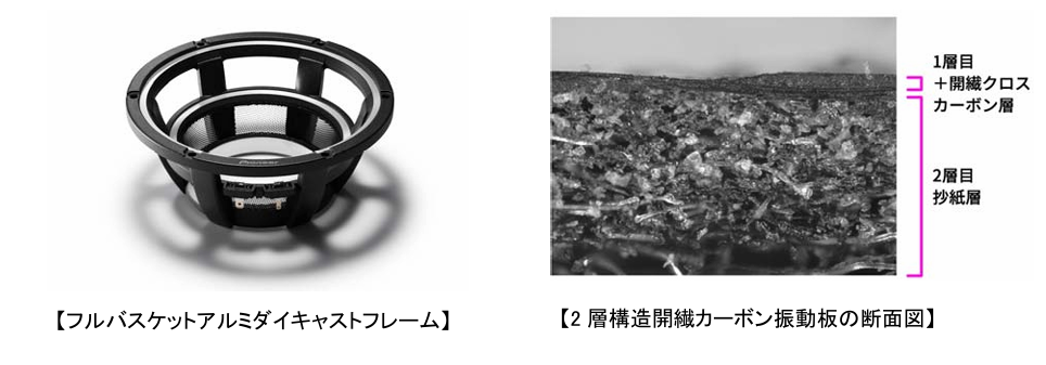 ウーファー部には、不要な共振を徹底的に除去する「フルバスケットアルミダイキャストフレーム」のほか、軽量かつ高剛性の開繊カーボンと抄紙を組み合わせた「2層構造開繊カーボン振動板」、強力な磁束を獲得し低歪み化を実現する「ネオジムマグネット」と磁気回路を採用。豊富な情報量で臨場感のある豊かな低音再生を実現します。