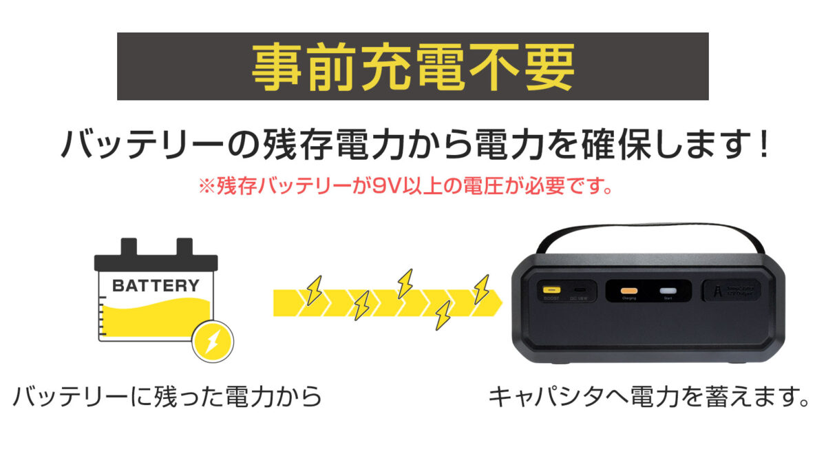 車に残っている電力を利用して、エンジンをスタートすることが可能になる電力を作り出すことが可能。事前充電が不要なので、急にバッテリーがあがっても問題ありません。