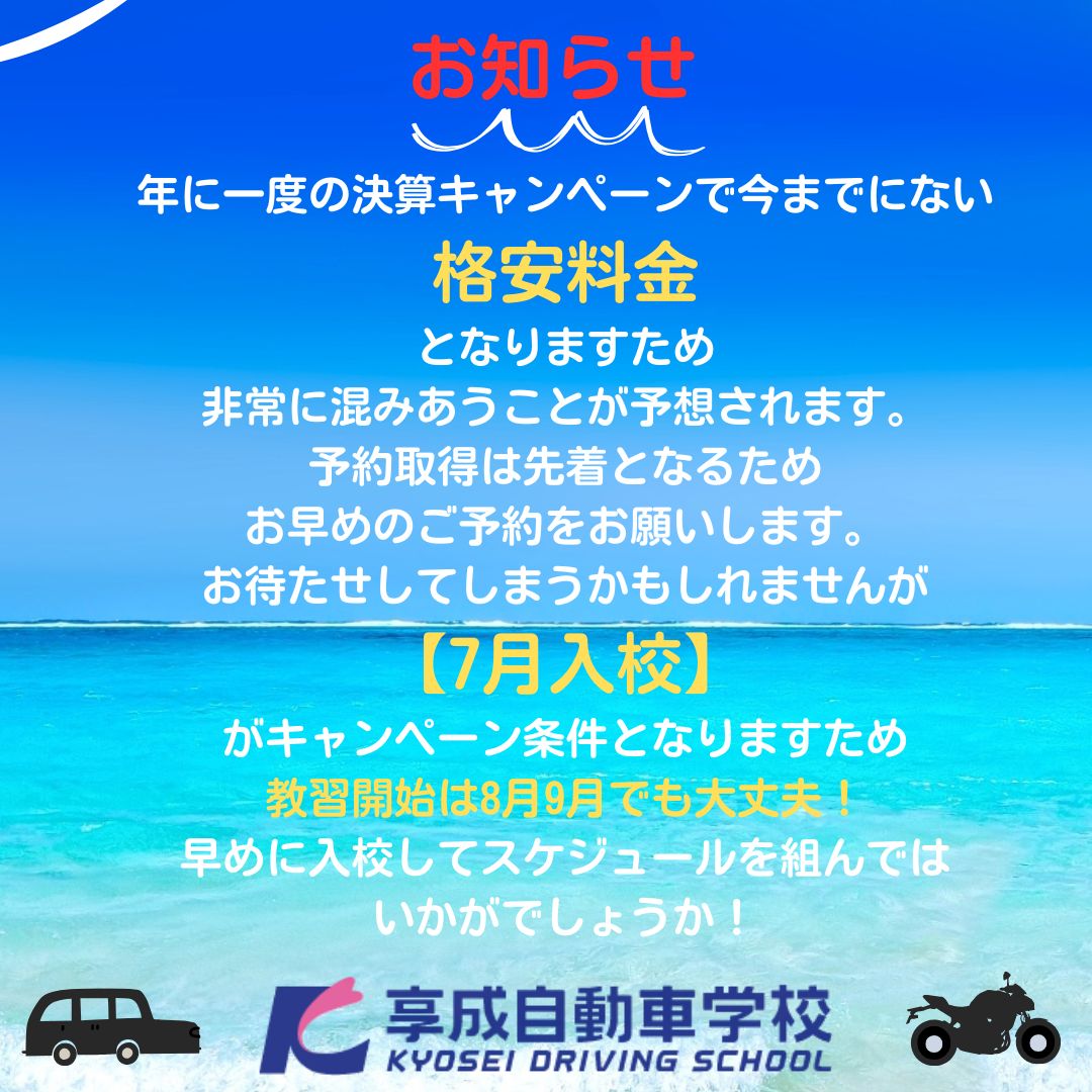 享成自動車学校 岡崎校・桜町校にて年に一度の「決算キャンペーン」実施のお知らせ