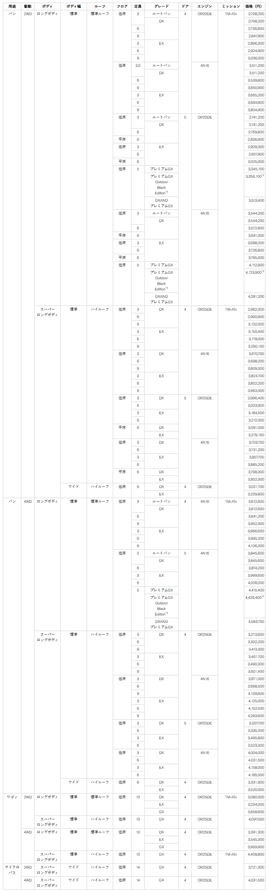 <キャラバン特装車 全国希望小売価格(消費税込み)>