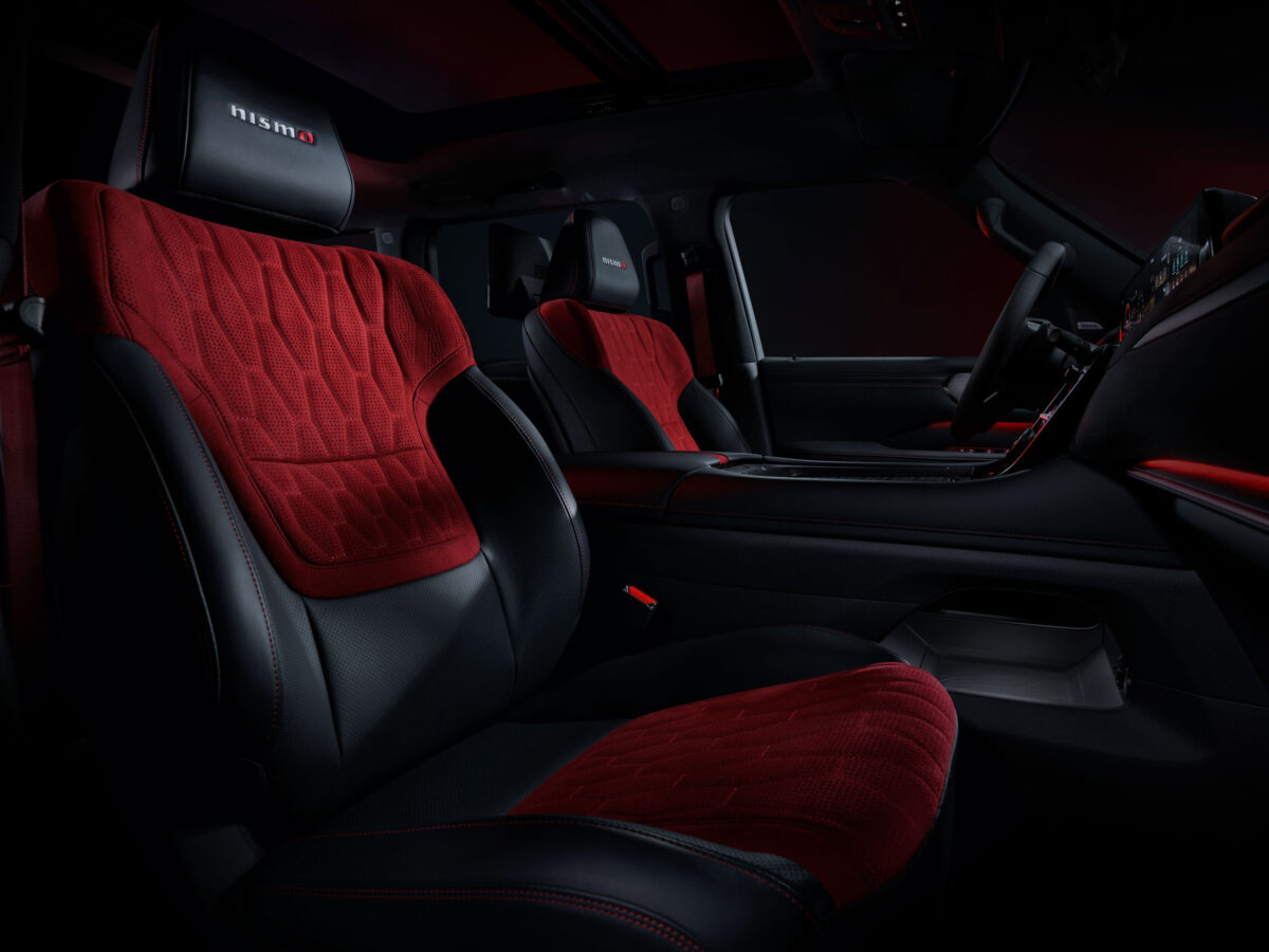 インテリアは、ダッシュボード、シート、ステアリング、ドアパネルをブラック基調としながら、精巧な金属調のフィニッシャーと高級感を感じるスエード調の表皮を採用しています。また、赤いシートベルトやスタータースイッチやカーボン調加飾を随所に配置することで、高性能モデルならではの雰囲気を演出しています。ヘッドレスト部分にNISMOロゴが刺繍されたスポーツシートは、本革と赤いスエード調素材の表皮を組み合わせるとともに、電動ボルスター調整機能を採用することで、体の滑りを抑えながらしっかりと身体をホールドします。