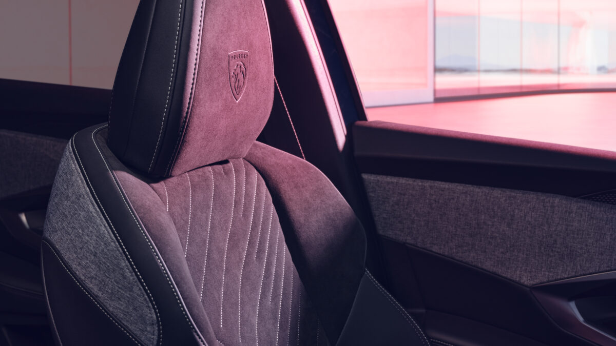 GT(アルカンタラパッケージ)グレードのシートは、アルカンタラ素材をシート中央部に使用し、身体が滑りにくく、ホールド感のあるシートを実現しました。ショルダー部までホールドするサイドサポートには、アダプティブボルスター機能をプジョーで初めて搭載し、シチュエーションに合わせて、ドライバー好みのフィット感に調整することが可能です。