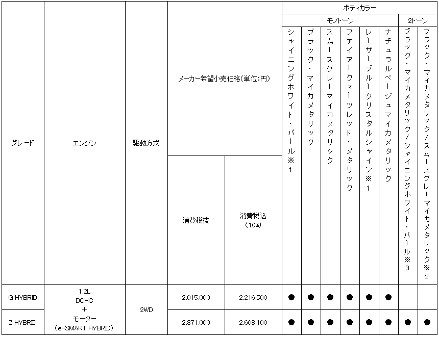 同モデルは、「G HYBRID」と「Z HYBRID」を新たに追加し、ラインアップを拡充した。搭載する「e-SMART HYBRID」は、発電専用エンジンとモーターで構成されたシリーズ方式を採用し、滑らかな加速と静粛性を実現している。また、燃費性能はWLTCモードで28.0km/Lと高水準を達成した。専用デザインの装備も充実し、日常からアウトドアまで対応する実用性の高い一台となる。
