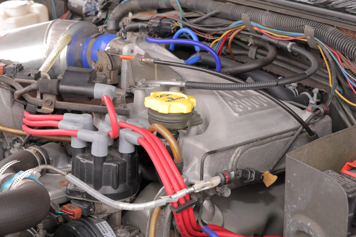 プラグコードはロールの物を使用して装着。つい最近オーバーホールを行ったとのことで、細部も新しくて綺麗だ。K&N製品も使用されている。このエンジンルームを披露しても「ノーマルです」と笑う。