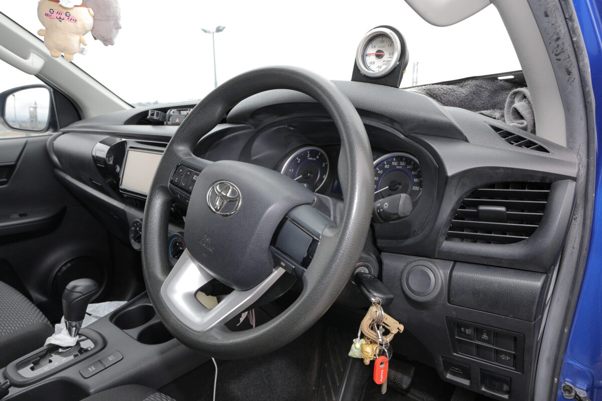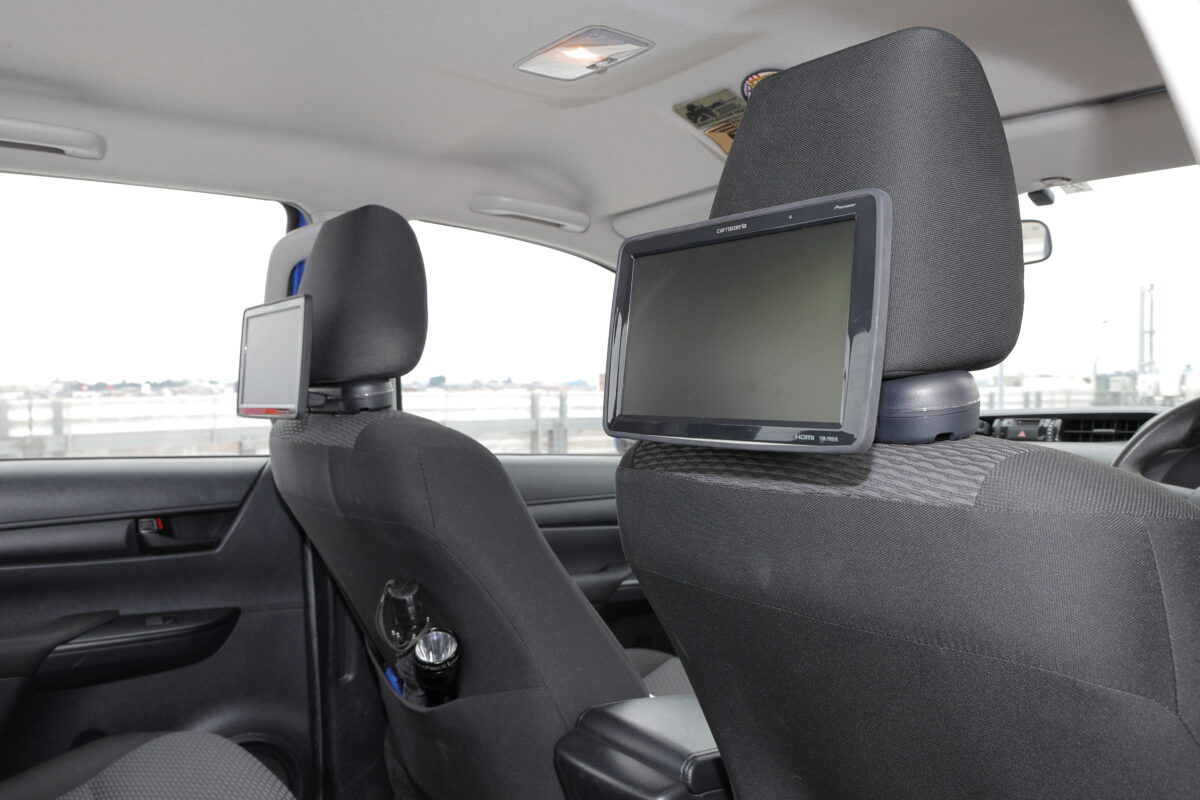 ブーストメーターは「低燃費な運転をしようかな」と、自宅にあったメーターを自身で作業して装着。ご家族を楽しませるために、後部座席用のモニターも装備している。