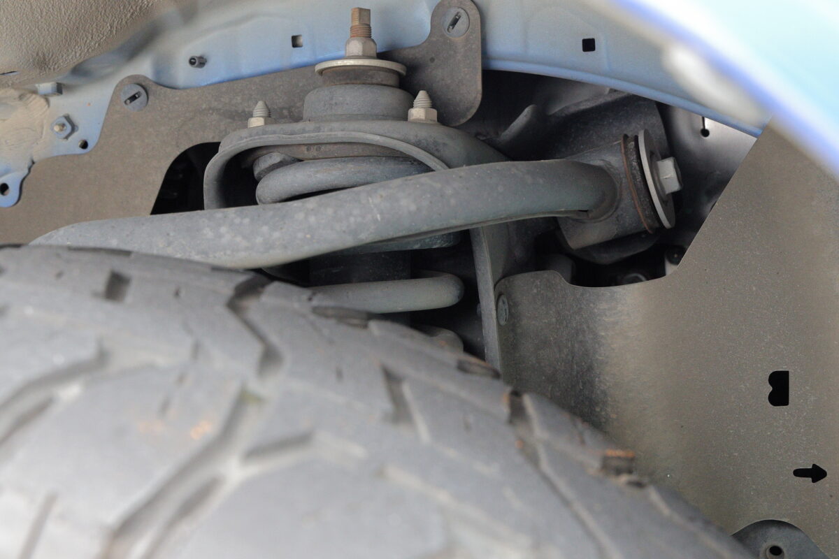 純正流用ということになるが、前期型の車両なのでハードタイプしかないところを後期型のスプリングを装着して乗り心地を向上させた。最初に乗った時に「なんとかしないとヤベーな」と感じたそう。家族のために行ったカスタムだ。