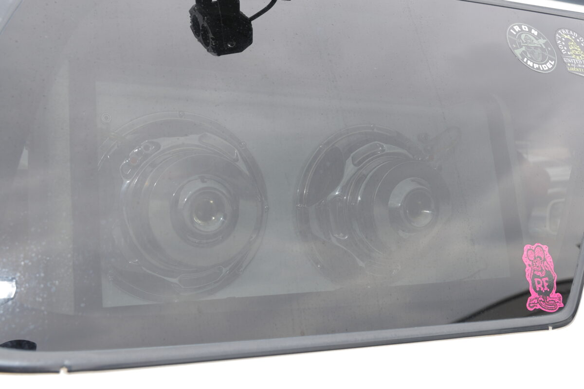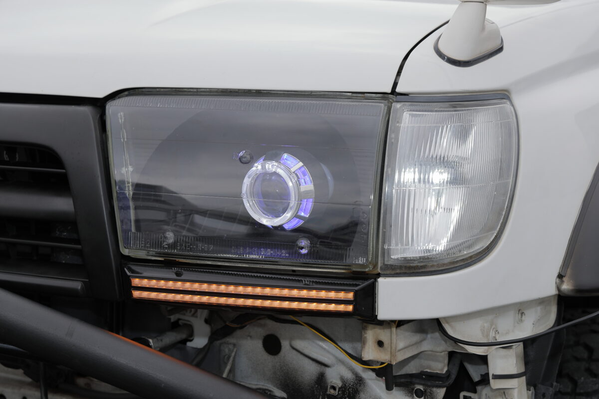自作ヘットライトはプロジェクターが入っている。普通のLEDのバルブだが、自分で割ってインナーを黒に塗って、プロジェクターを入れた。イカリング風の仕上がりだ。下部にはウインカーを配置。本来はバンパーに付いているのだが、バンパーを交換して付かなくなったので汎用品を使用して移動した。