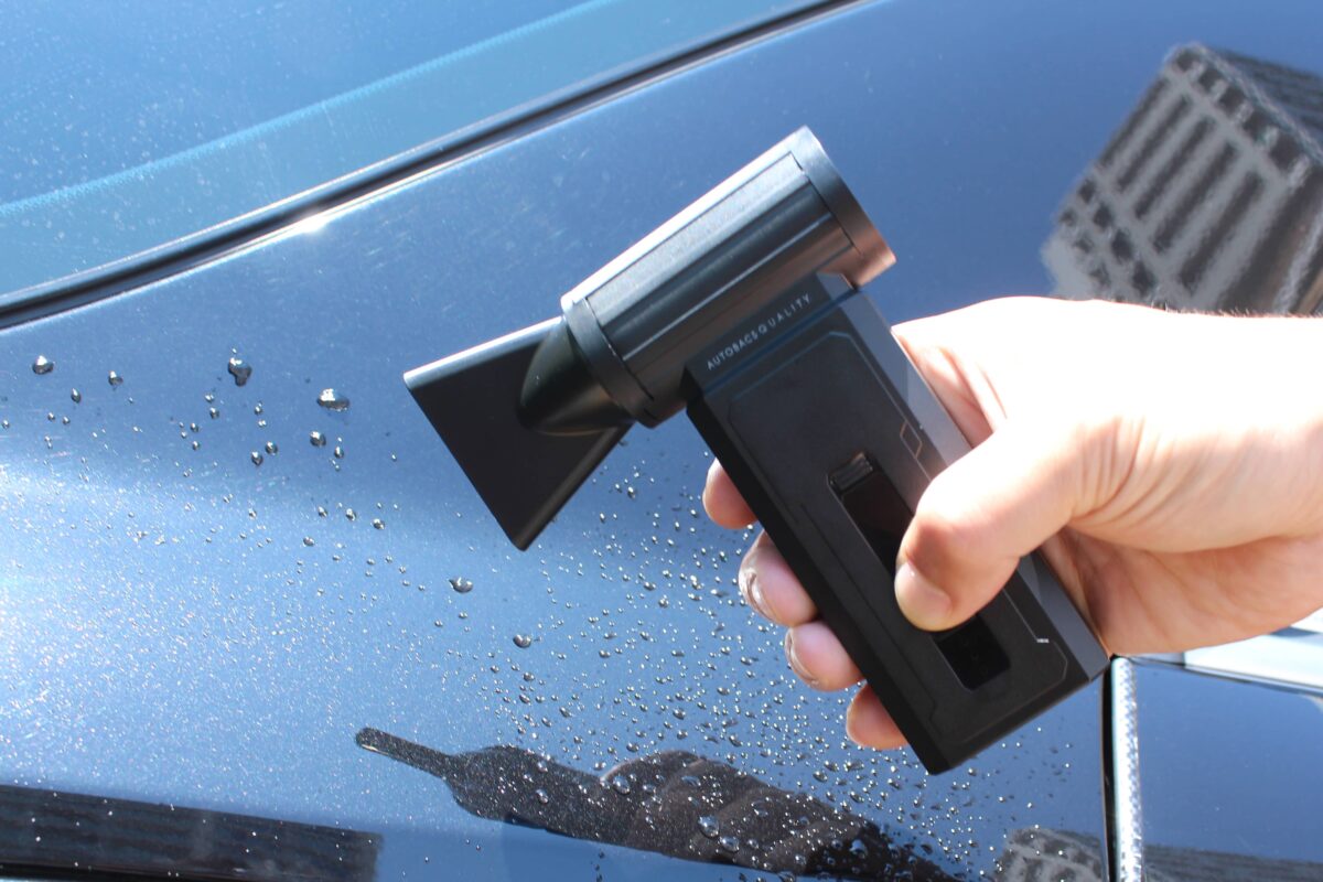 ■ 「AQ. ハイパワーブロアーmini」は、小型でも強力な風圧により、洗車後の拭き取りにくい隙間に残った水滴などをスピーディに除去します