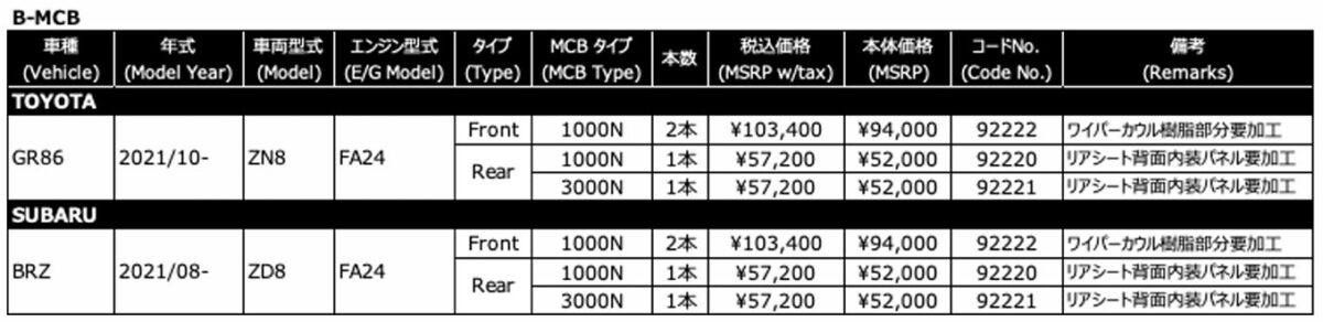 GR86/BRZ(Z#8)用より販売開始。リア用には1000Nと3000N、2つのラインアップ。