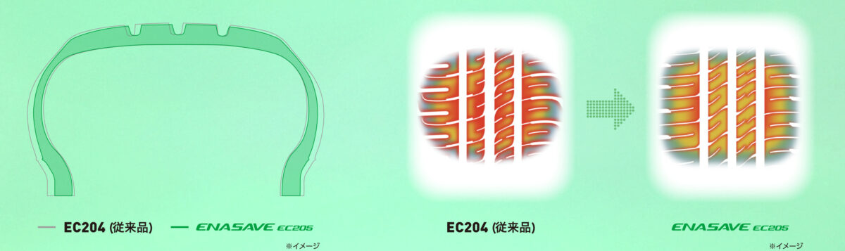 『ENASAVE EC205』は、低燃費性能とロングライフ性能を維持しながら、雨天時の安全性を高めるウエット性能を強化したタイヤです。従来品『ENASAVE EC204(エナセーブ イーシーニーマルヨン)』から低燃費性能および耐摩耗性能を維持しています。さらに、新開発ゴムの採用により全50サイズ中27サイズがウエットグリップ性能”b“を取得し、従来品『ENASAVE EC204』と比較してウエットブレーキ性能を約6%向上させています。全50サイズのラインアップで、コンパクトカーからセダンまで幅広い車種に対応します。