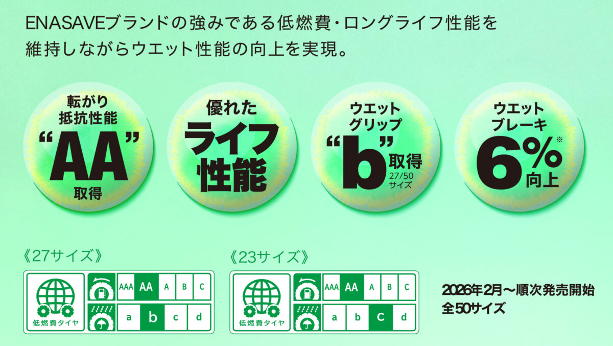 住友ゴム工業株式会社は、低燃費・長寿命・ウエット性能の三拍子を備えたDUNLOPの新製品タイヤ「ENASAVE EC205」を2026年2月より順次発売する。