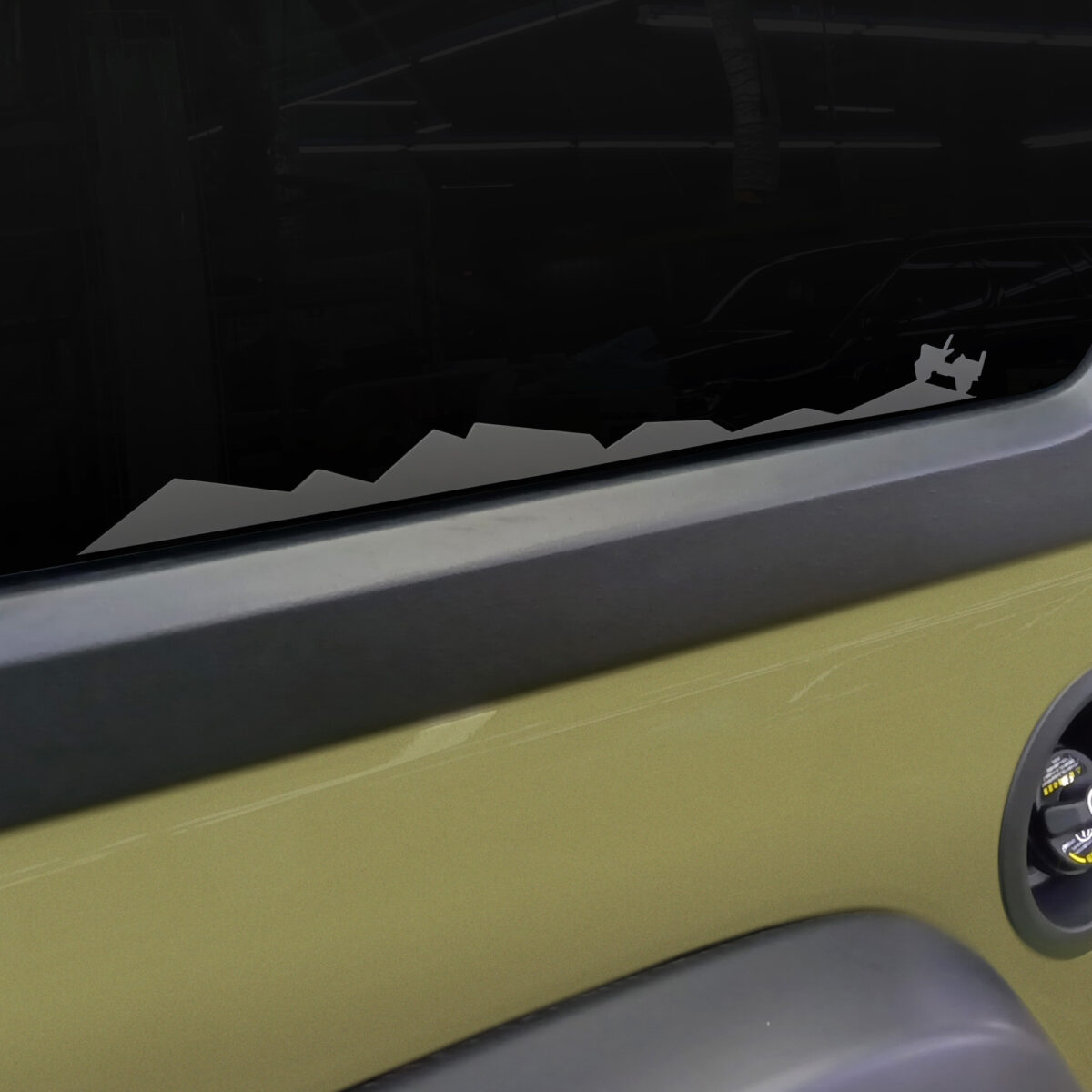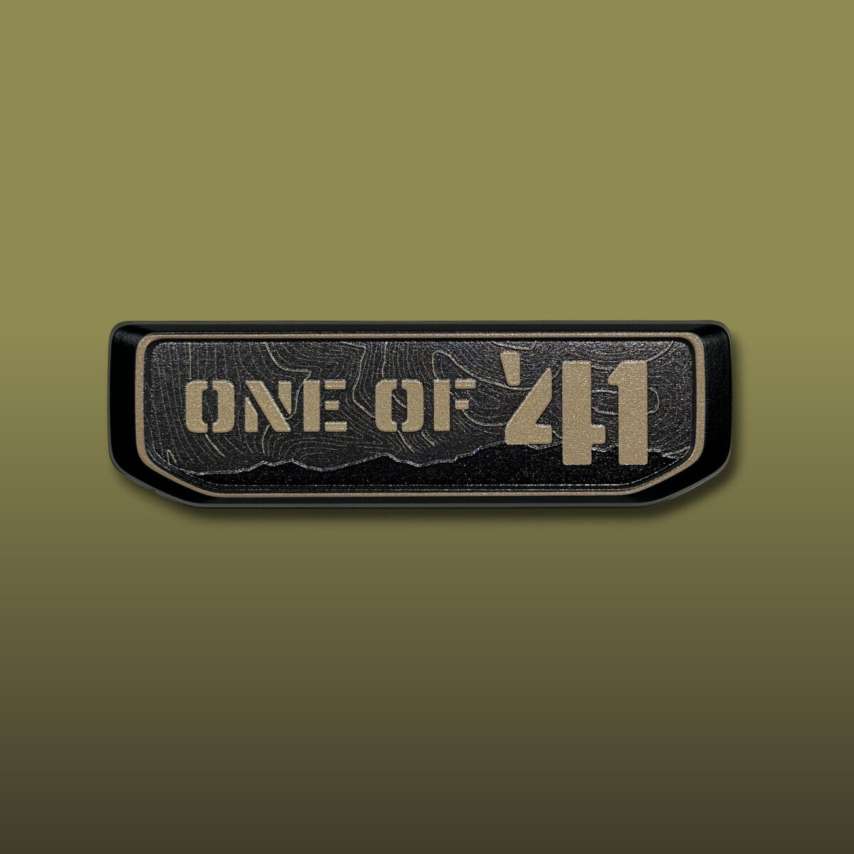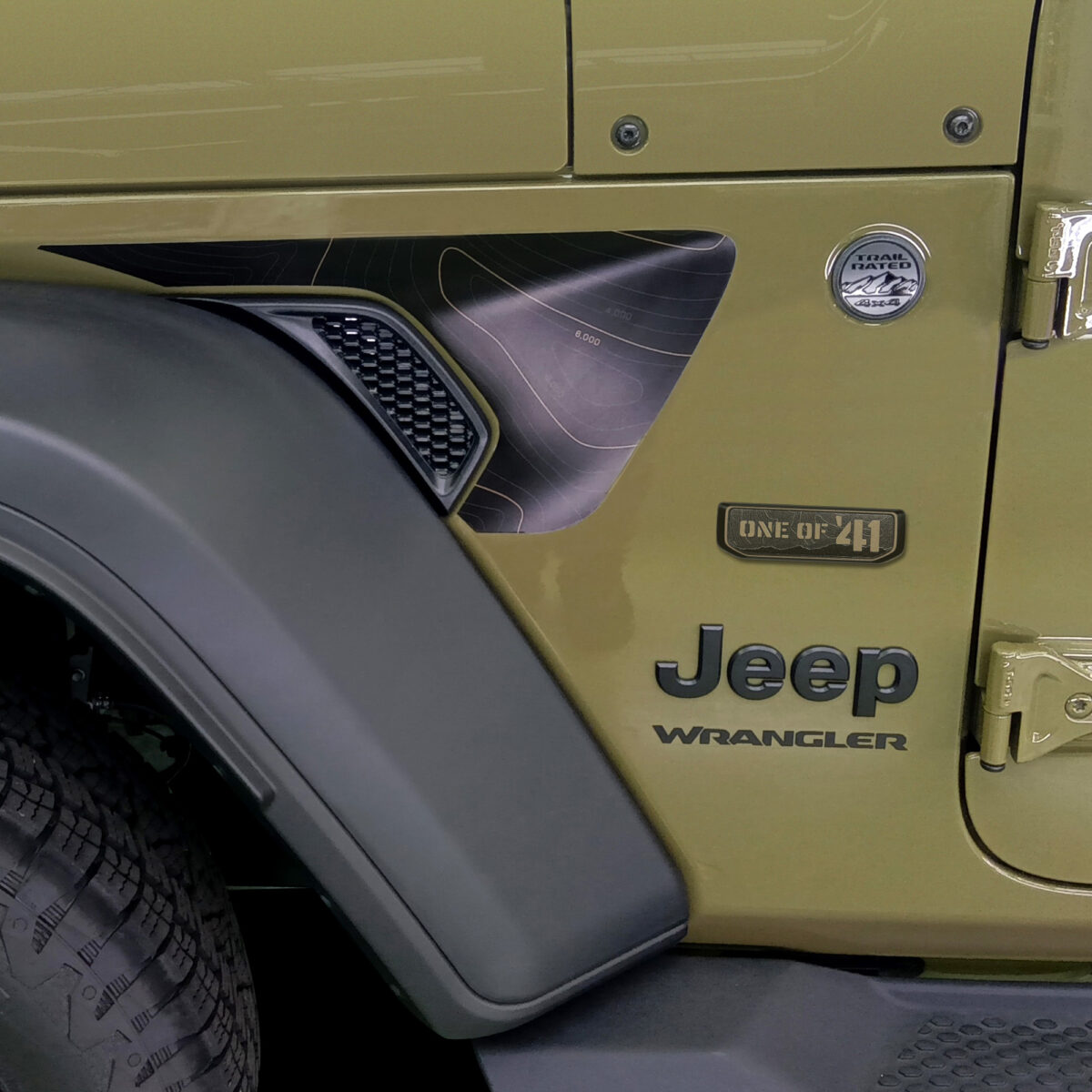 他には、フェンダーとリアウインドウに、それぞれ山頂への等高線や山の稜線を走るWillys MBのシルエットが描かれたデカール※ が施されています。さらに、車両の左サイドには「One of ‘41」の特別バッジを装着して、冒険心あふれる世界観を表現しています。