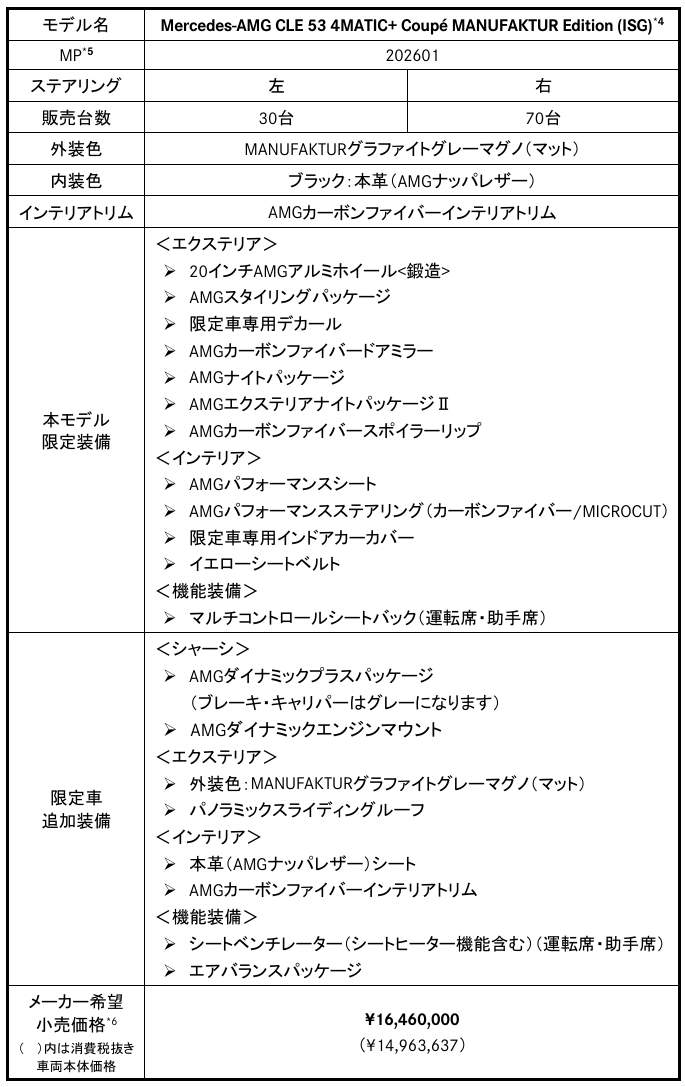 メルセデス・ベンツ日本合同会社は、特別仕様車「Mercedes-AMG CLE 53 4MATIC+ Coupé MANUFAKTUR Edition (ISG)」を全国限定100台で発売すると発表した。