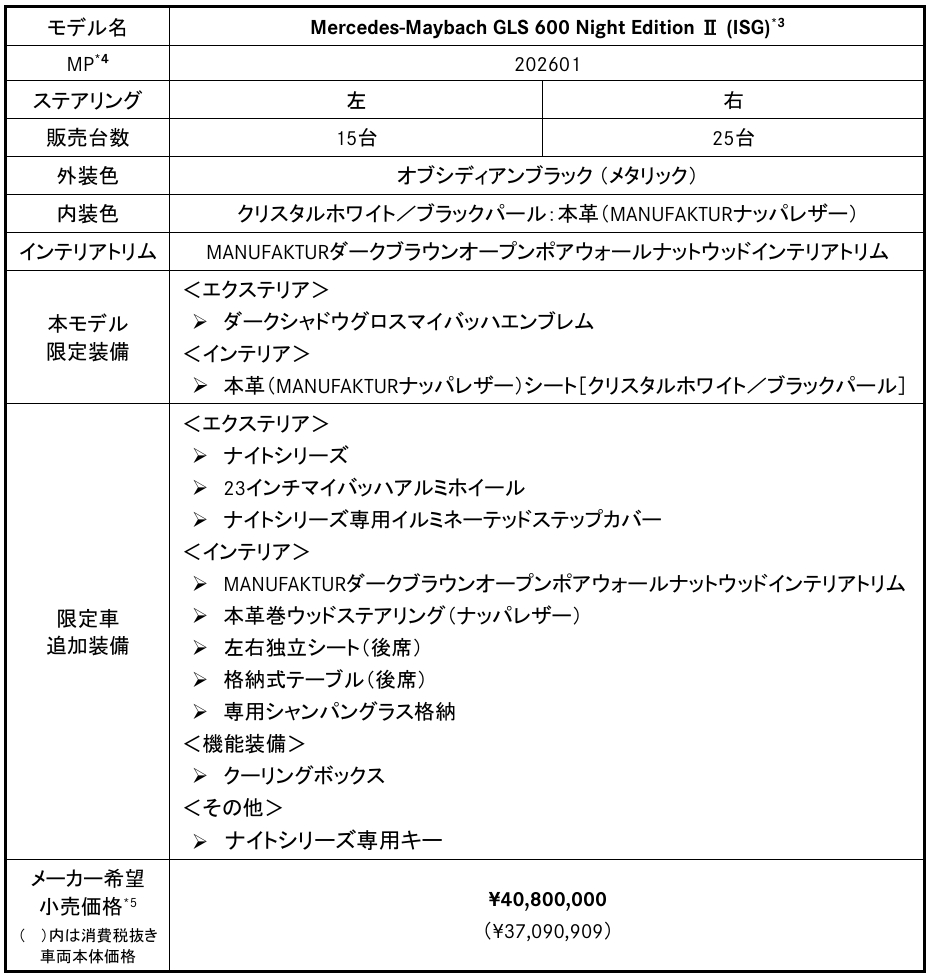 メルセデス・ベンツ日本合同会社(社長 兼 CEO: ゲルティンガー 剛、本社: 千葉県千葉市)は、「Mercedes-Maybach GLS 600 (ISG) 」の特別仕様車「Mercedes-Maybach GLS 600 Night Edition Ⅱ (ISG) 」を限定発売いたします。本日より全国のメルセデス・ベンツ正規販売店ネットワークを通じて注文の受け付けを開始し、お客様への納車は2025年11 月中旬以降を予定しております*2。(全国限定 合計40台(左ハンドル15台、右ハンドル25台))