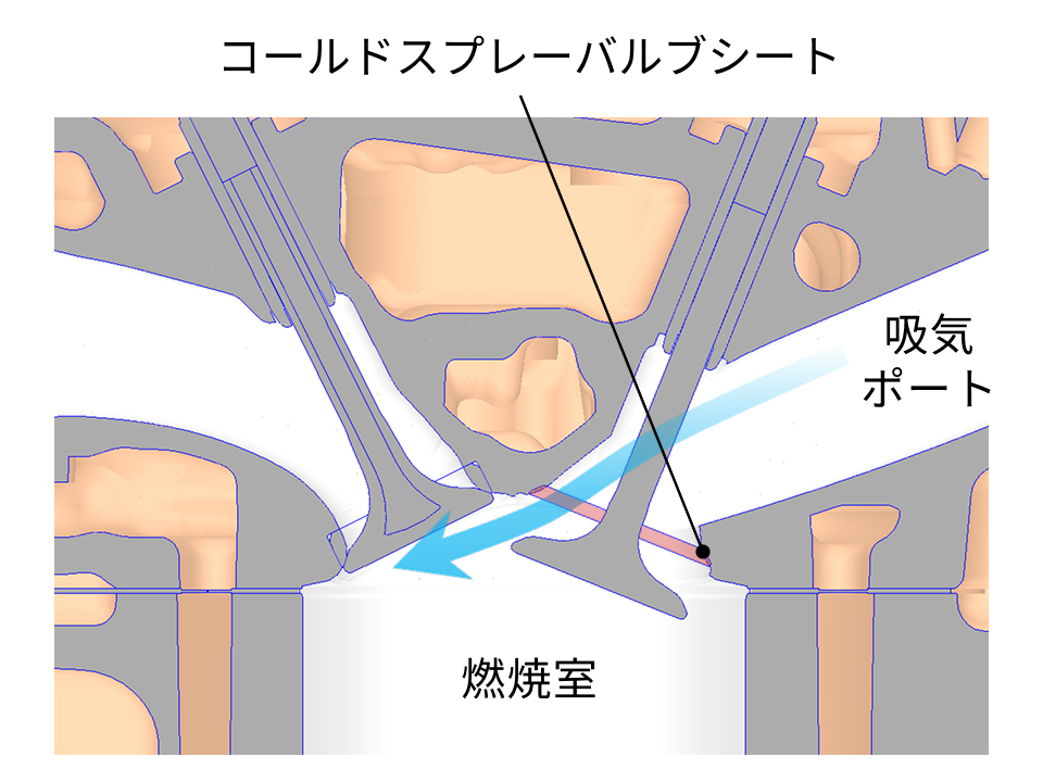 今回開発したコールドスプレー工法を用いたバルブシートは、シリンダーヘッドの表面に被膜を形成するもので、別体のバルブシートが不要となり、理想の吸気ポート形状を実現しています。この新しい工法は、アルミ合金製シリンダーヘッドの表面に異種の金属粉末を超音速で吹き付けることで強固な被膜を形成します。材料の融点以下で施工するコールドスプレー技術は、材料を溶融することなく異種材を接合できるため、通常の溶融接合で課題となる被膜と基材の界面での金属間化合物の過剰生成や基材が溶融することで発生する微小な空洞形成(ポロシティ)といった現象を抑え、類似工法に比べ高い熱伝導率でバルブ周りの冷却性を向上させるとともに、高い耐久性と信頼性も実現します。