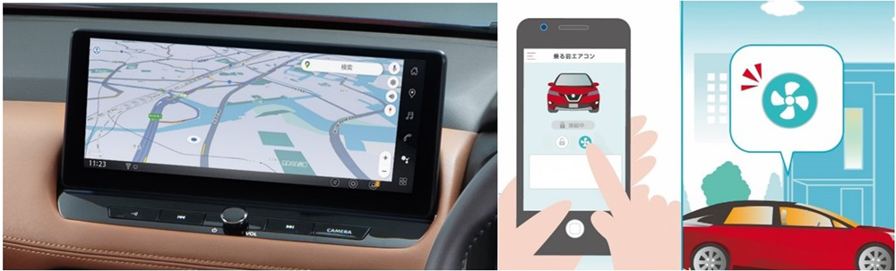 日産で国内初となる、Google搭載のNissanConnectインフォテインメントシステムは、Googleマップでのルート案内や、音声での目的地検索や車両の操作ができるGoogleアシスタント、さらには様々なアプリをダウンロードできるGoogle Play ストアがインストールされています。お客さまのGoogleアカウントを設定することで、スマートフォンと情報をよりシームレスに活用できます。さらに、ワイヤレスApple CarPlay®、ワイヤレスAndroid Auto™**、NissanConnect ®サービス、車内Wi-Fiも利用可能です。またNissanConnectアプリを使えば、スマホから車内のエアコンを作動させる機能や、降車時のドアロック忘れをスマートフォンに通知しリモートでドアをロックできる機能を新規追加し、快適性と安心感を向上させました。