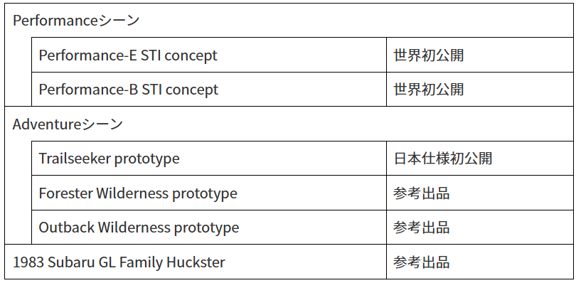 ブース内の、Performanceシーンを演出するエリアでは、2台のコンセプトモデル「Performance-E STI concept」と「Performance-B STI concept」を世界初公開しました。また、Adventureシーンを演出するエリアでは、「Forester Wilderness prototype」、「Outback Wilderness prototype」を展示するとともに、「Trailseeker prototype」(日本仕様車)を初公開しました。