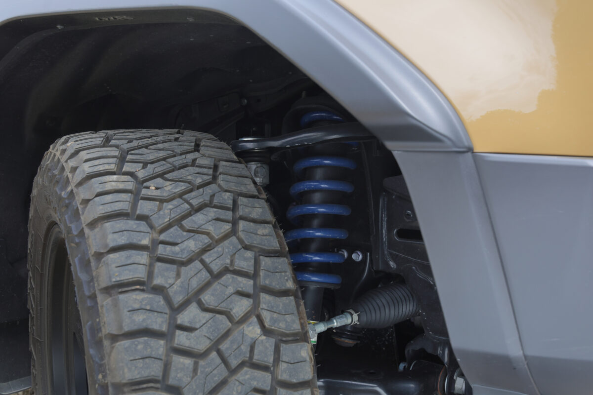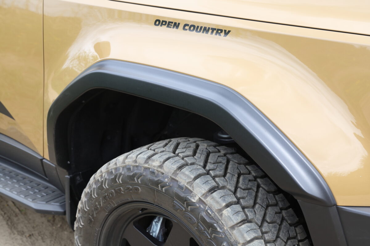 カントリーサスペンションスプリングによって車高を2インチ上げていることで、ちょっとしたラフやバンプでも余裕を持って走破できる。加えて、強度と剛性に優れた鍛造モデル「BRADLEY FORGED 匠」の採用により、オフロードでのホイール変形を抑え、高い走破性と信頼性を実現している。さらに、20インチという大径サイズが障害物を乗り越える際の接地角度を緩やかにし、悪路でもスムーズな走行を可能にしている。