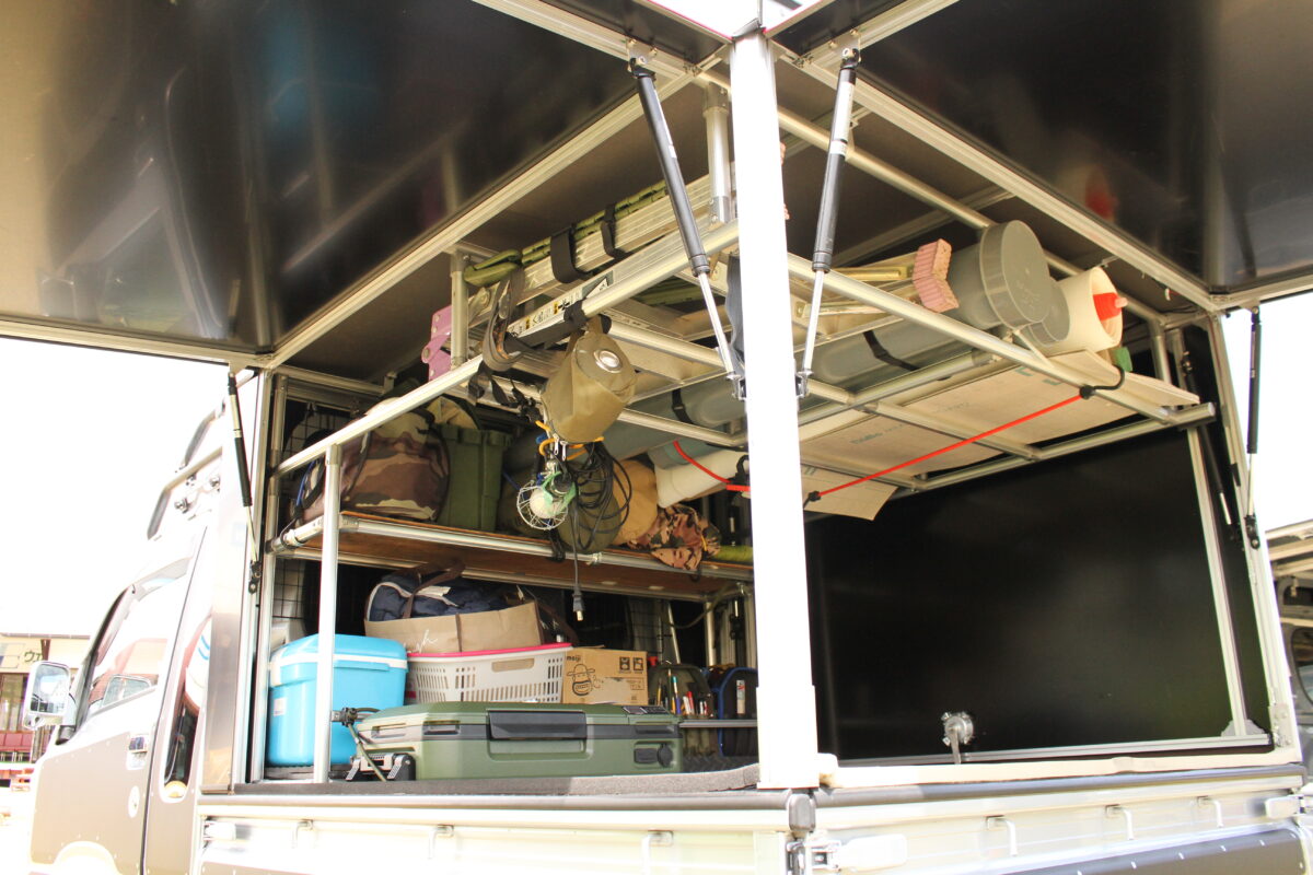 同社の「カーゴボックス」は、アルミとステンレスを用いた軽量かつ高耐久な構造が特徴。三方のパネルが開閉できる設計により、荷物の積み下ろしが格段にしやすく、開いた外板は日除けや雨除けとしても活用できる。アウトドアや車中泊、農業、建築業といった幅広いシーンに対応しており、まさに“使える荷台”を実現する装備といえる。