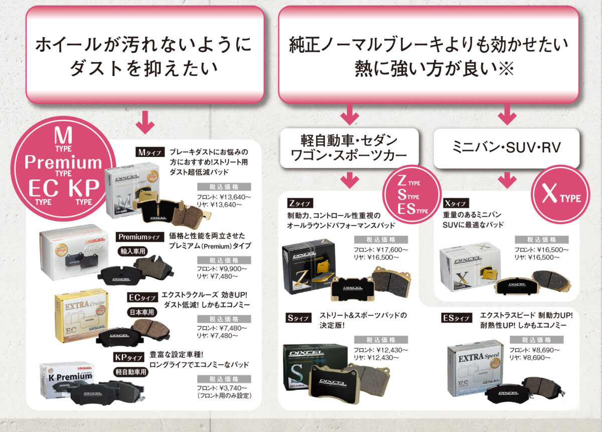 ブレーキパッドやディスクローターには車種や用途に合わせて様々な種類がある。それゆえに自分の愛車にどれが適合するのか、またどのような組み合わせをすればベストなのか分かりにくいもの。ここではタイプに合わせてどの組み合わせが良いのかをディクセルのブレーキパーツを例に解説していこう。