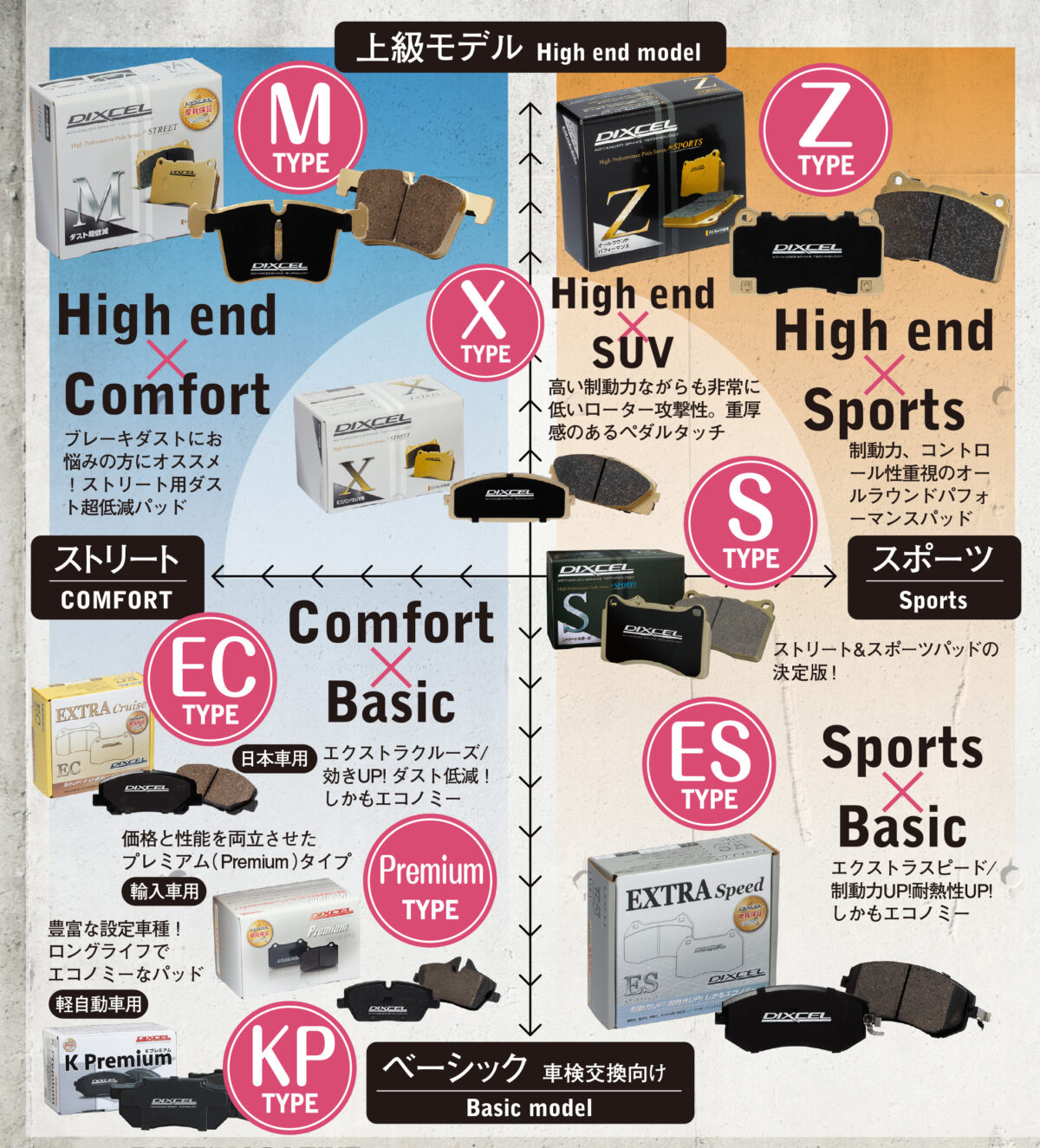 どのブレーキパッドがどんな目的で作られているのか、縦軸と横軸に分類して、マトリクス図にしてみた。これであればブレーキに詳しくない人もでポジションや相関関係がビジュアルで見られるので分かりやすいはずだ。