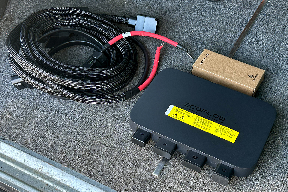 薄型の800wオルタネーターチャージャー本体を壁面に取り付ける。今回はテスト運用なのでサイドバーに吊るしてみた。配線はかなり長いので装着場所の自由度が高く、ほとんどの車種で問題なく取り付けられるはずだ。