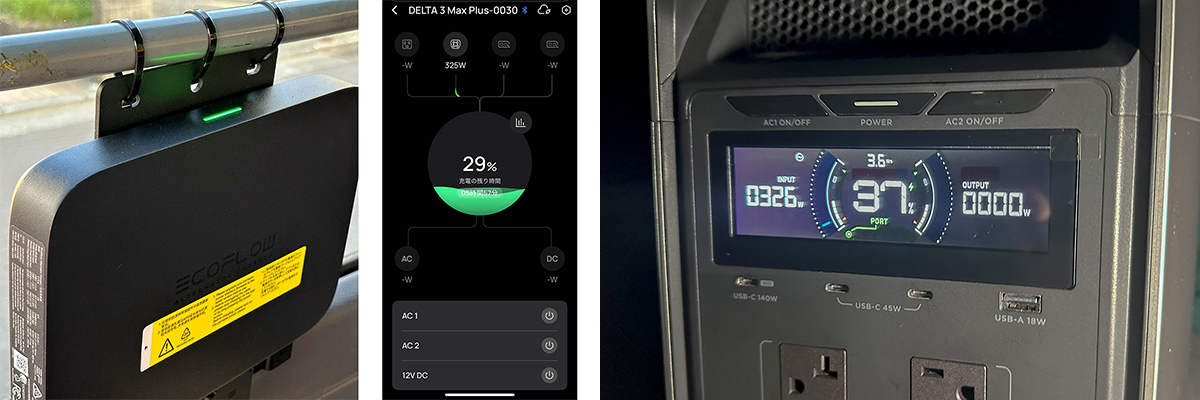 ポータブル電源は事前に充電をしておく必要がある。DELTA 3 Max Plusは内蔵バッテリーの容量が大きい(そのため多くの機器にハイパワーで供給できる)のだが、急速充電機能を備えているため、比較的短時間での充電が可能。家庭用のAC100V電源(1500w)であれば、最短108分で満充電にすることができる。