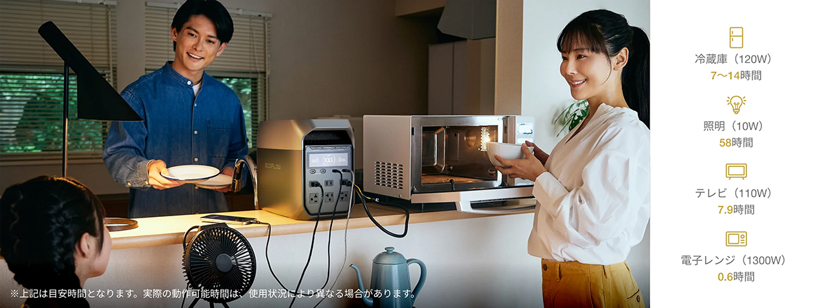 キャンプなどのアウトドア・アクティビティで活用することはもちろん、台風などの災害時に停電したときなどは、室内で照明やテレビ、冷蔵庫、電子レンジ、ドライヤーといった家電を動かす非常用電源としても利用できる。