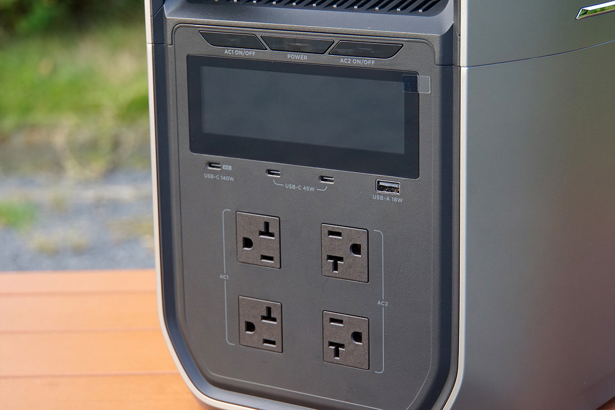 出力ポートは正面にAC100Vを4つと、USB-A(18W)×1、USB-C(45W)×2、USB-C(140W)×1を装備。複数の家電やスマートフォン、タブレットなどに電源を供給することができる。