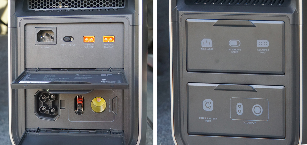 背面の上部にはAC電源や、別売のソーラーパネルからの入力ポートを装備。下部には容量拡張や車載充電に使えるエクストラバッテリーポートのほか、シガーソケットなどのDCアウトプットポートを備えているなど、さまざまな供給方式に対応している。