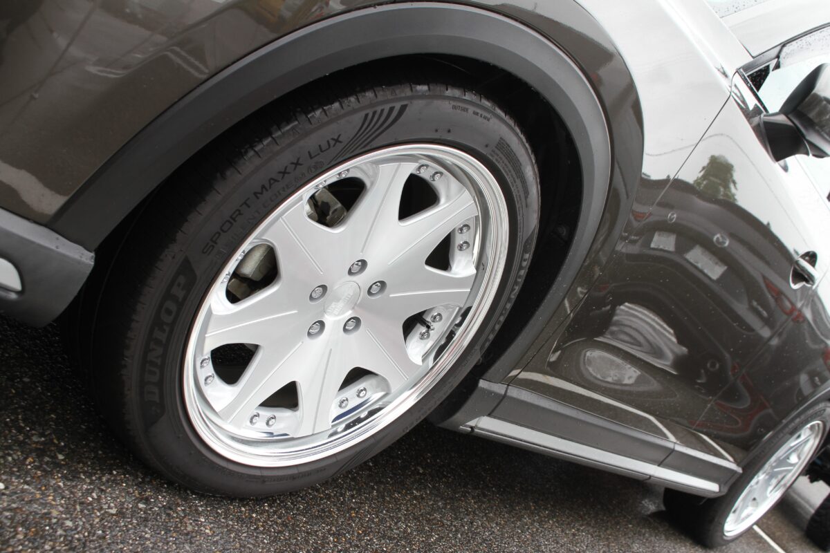「レオンハルト ヴァッフェのアルミホイールですね。『珍しいね』とよく言われます。自分はディスク系のデザインが好きで、今履いているのは復刻版。SUVとよくマッチしているし、車体のカラーリングとも相性がいいですね」