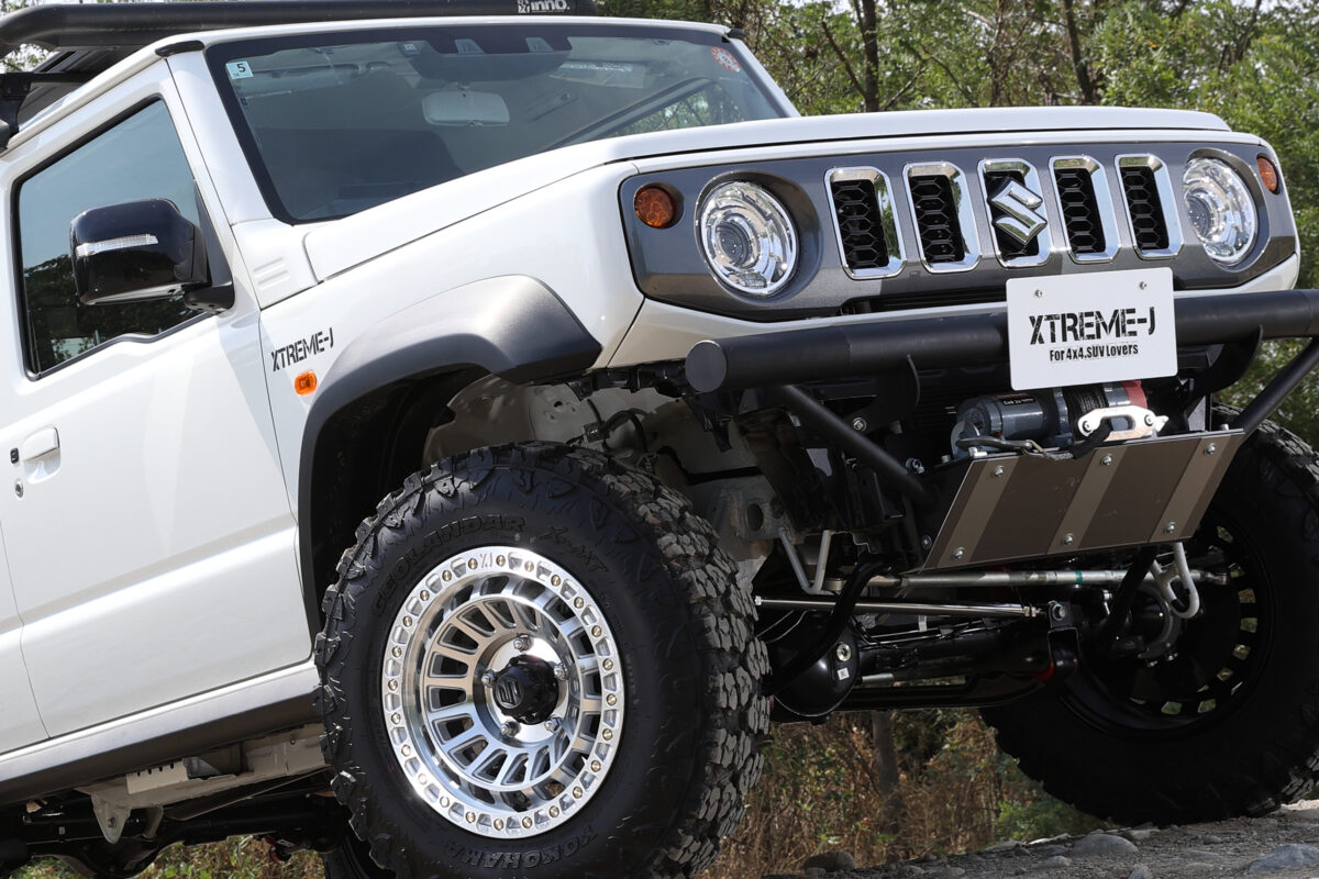XJ08のサイズは「17×7.5J +40」。「35×12.57」タイヤを合わせ、エクストリーム感がハンパない仕上がり。車高は40mmリフトアップ。