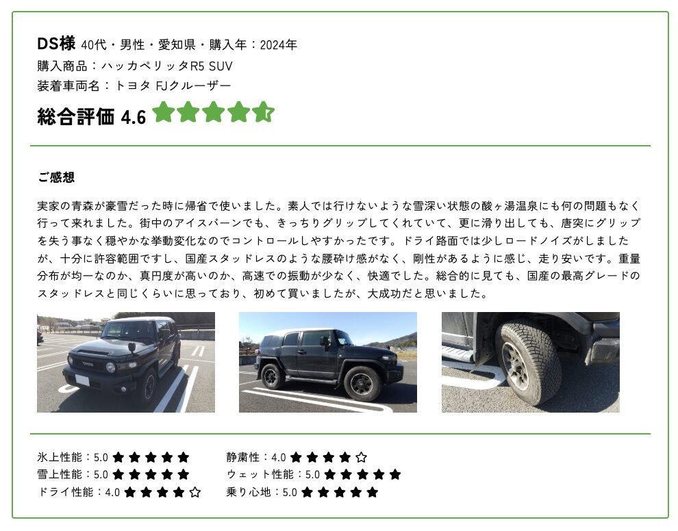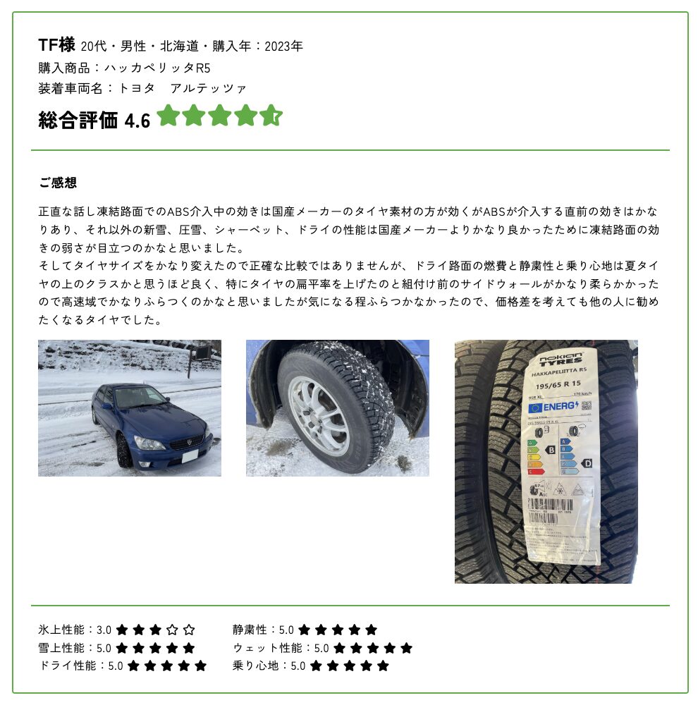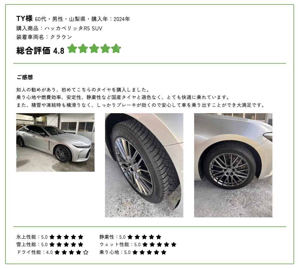 ノキアンタイヤ公式のユーザーレビューページでは、実際にスタッドレスタイヤを使用しているユーザーの声が多数掲載されている。実際の使用感や体験談は、タイヤ選びの際に大いに参考になるはずだ。ぜひチェックしてほしい。