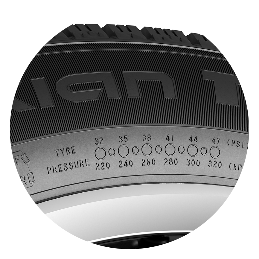 サイドウォールには、空気圧やタイヤ装着位置をメモできるエリアもあり。車両の適性空気圧をマーカーなどでチェックできるほか、タイヤを外した際の装着位置をメモができ、次の装着時に迷うことがない。