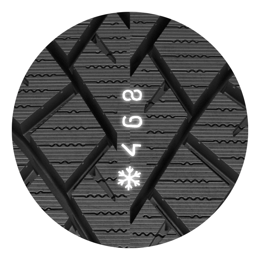 スタッドレスタイヤの交換時期ってわかりにくいもの。そこで、ノキアンタイヤではタイヤの溝の深さが一目で分かるインジケーターを採用。タイヤ表面に「❄︎468」のマークを4カ所に設置。溝が8mm以下になると「8」のマークが消え、残っている数字で残りの溝の深さがチェックできるのだ。ちなみに、4mm以下になると「4」「❄︎」マークが一緒に消えていき、「❄︎」が消えたらスタッドレスタイヤの交換タイミングとなる。