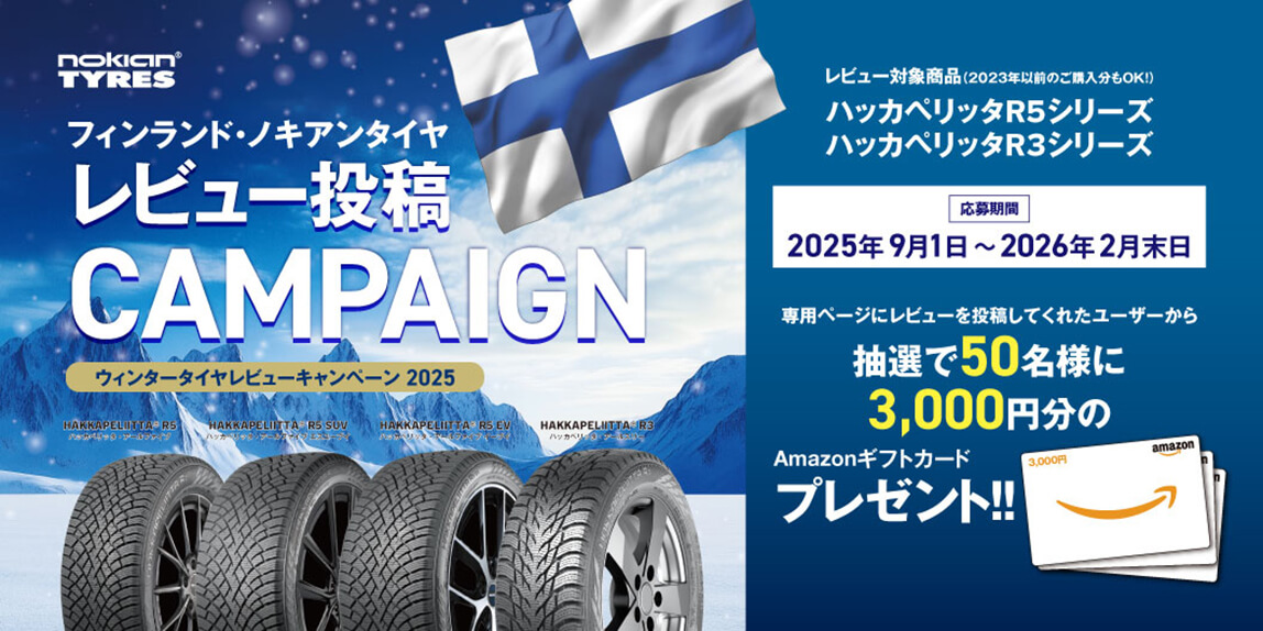 ノキアンタイヤでは『ウインタータイヤレビューキャンペーン2025』を実施中だ。レビュー対象商品のハッカペリッタR5シリーズ、ハッカペリッタR3シリーズのタイヤを愛車に履かせている日本国内在住の成人なら応募可能だ。応募方法などの詳細は、専用サイトで要確認。