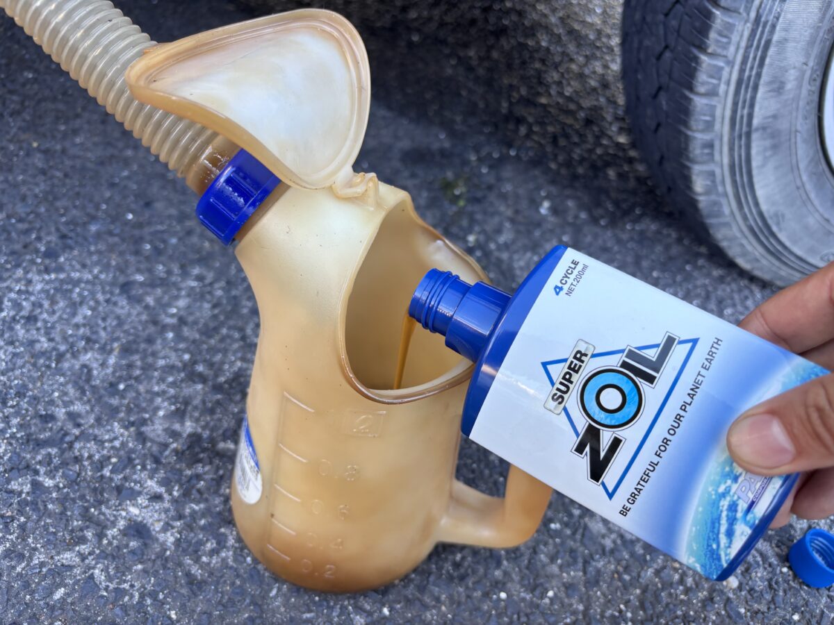 オイル交換時、新しいエンジンオイル容量に対して5%を添加するだけ。アクティは2.5Lのエンジンオイルが必要なのでmL換算するとオイル2375mL+スーパーゾイルエコ125mLの配合になる。